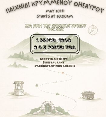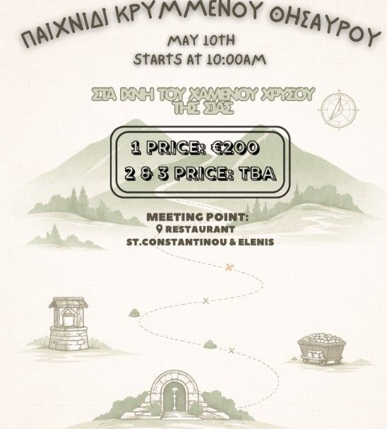 Hidden Treasure Hunt in Sia — outdoor adventure with riddles, strategy and a €200 prize, May 2026. €5 per person, ages 6+. --- Scroll down for English version 👇 --- Η Α.Ε. Σιας σε συνεργασία με την Active Zone Outdoor διοργανώνει το πρώτο Κυνήγι Κρυμμένου Θησαυρού στη Σια. Μια μοναδική περιπέτεια γεμάτη γρίφους, στρατηγική και δράση για όλες τις ηλικίες. Συγκεντρώστε την ομάδα σας και διεκδικήστε τον θησαυρό. 🎟️ Εισιτήρια από €5 ανά άτομο. Έπαθλο: €200. Κατάλληλο για ηλικίες 6+. 🗓️ Πρόγραμμα Κυριακή, 10 Μαΐου 2026 | 10:00 (Περίπτερο Αγ. Κωνσταντίνου & Ελένης, Σια) Εγγραφή: forms.gle/jnCGRk5pVA755Ra2A ❓ Συχνές Ερωτήσεις Ε: Για ποιες ηλικίες απευθύνεται; Α: Για όλες τις ηλικίες, από 6 ετών και πάνω. Ε: Πόσα άτομα χρειάζεται κάθε ομάδα; Α: Επικοινωνήστε με τους διοργανωτές μέσω της φόρμας εγγραφής για λεπτομέρειες. Ε: Τι κερδίζει η νικήτρια ομάδα; Α: Χρηματικό έπαθλο €200. --- EN A.E. SIAS in collaboration with Active Zone Outdoor presents the first Hidden Treasure Hunt in Sia, Nicosia, Cyprus. An exciting outdoor adventure full of riddles, strategy, and action for all ages. Gather your team and compete for the treasure. 🎟️ Ticket prices start from €5 per person. Prize: €200. Suitable for ages 6+. 🗓️ Schedule Sunday, May 10, 2026 | 10:00 (St. Constantinou & Elenis, Sia) Registration: forms.gle/jnCGRk5pVA755Ra2A ❓ FAQ Q: What ages is it suitable for? A: All ages, from 6 years and above. Q: How many people per team? A: Contact the organisers through the registration form for details. Q: What does the winning team get? A: A cash prize of €200. Explore more Family & Kids → eventor.com.cy/events/category/family---kids-112