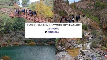 Join a guided hiking trip in Machairas this March 2026 to Kolympos tou Filaniou, including monastery visit, picnic and transport from Nicosia. Booking required. Scroll down for English version 👇 Το τουριστικό γραφείο Salonica View διοργανώνει μονοήμερη πεζοπορία στον Κόλυμπο του Φιλανιού, στην περιοχή του Μαχαιρά, την Κυριακή 22 Μαρτίου 2026, με αναχώρηση στις 08:00 από το Κέντρο Κυπριακής Χειροτεχνίας στη Λευκωσία. 🎟️ Κόστος συμμετοχής: €20 / άτομο (η πληρωμή γίνεται στο λεωφορείο). Η εκδρομή περιλαμβάνει προσκύνημα στη Μονή Μαχαιρά και σύντομη στάση ξεκούρασης, πριν από την έναρξη της πεζοπορίας από το κρησφύγετο του Γρηγόρη Αυξεντίου. Η διαδρομή (6,5 χλμ. γραμμική, 2–2,5 ώρες, βαθμός δυσκολίας 1 προς 2) ακολουθεί τμήμα κατά μήκος του Πεδιαίου ποταμού και περνά από τη μεγάλη ξύλινη γέφυρα του Τμήματος Δασών. Σημεία ενδιαφέροντος: • Μονή Μαχαιρά • Κρυψώνα Γρηγόρη Αυξεντίου • Ξύλινη Γέφυρα • Κόλυμπος του Φιλανιού (φυσική λίμνη, παλιό λατομείο) • Εκκλησάκι Αγίου Ονουφρίου Μετά την ολοκλήρωση της πεζοπορίας, θα ακολουθήσει ελεύθερος χρόνος για πικ-νικ σε εκδρομικό χώρο (ο κάθε συμμετέχων φέρνει το δικό του φαγητό). Η επιστροφή στη Λευκωσία υπολογίζεται περίπου μεταξύ 16:00–16:30. Στην τιμή περιλαμβάνονται: • Μεταφορά με λεωφορείο από και προς Λευκωσία • Συνοδεία και οργάνωση από έμπειρους συνοδούς • Κουτί πρώτων βοηθειών Απαραίτητος εξοπλισμός: Αθλητικά ή ορειβατικά παπούτσια, σακίδιο πλάτης, νερό και σνακ, αδιάβροχο, καπέλο, αντηλιακό, δεύτερα ρούχα και μικρή πετσέτα. Η κράτηση γίνεται ηλεκτρονικά μέσω του συνδέσμου: tinyurl.com/bdfubpza EN This guided hiking trip to Kolympos tou Filaniou in the Machairas area takes place on Sunday, March 22, 2026, organised by Salonica View, with departure at 08:00 from the Cyprus Handicraft Centre in Nicosia. 🎟️ Participation fee: €20 per person (payment on the bus). The excursion includes a visit to Machairas Monastery, followed by a hike starting from the hideout of Grigoris Afxentiou. The route is 6.5 km (linear), lasting approximately 2–2.5 hours, with difficulty level 1–2. Highlights include the Pedieos River trail, the large wooden bridge built by the Forestry Department, Kolympos tou Filaniou natural lake (a former quarry), and the chapel of Agios Onoufrios. After the hike, participants will enjoy free time for a picnic (each person brings their own food) before returning to Nicosia around 16:00–16:30. Included: • Round-trip bus transportation from Nicosia • Experienced guides and organisation • First aid kit Booking is required via: tinyurl.com/bdfubpza Explore more Outdoor & Adventure → eventor.com.cy/events/category/outdoor---adventure-125 ❓ FAQ Q: What is the difficulty level of the hike? A: Level 1 to 2 (moderate, suitable for participants with basic fitness). Q: Is transport included? A: Yes, bus transport from and back to Nicosia is included. Q: What should I bring? A: Suitable footwear, water, snacks, rain jacket and personal essentials. Q: How do I pay? A: Payment (€20) is made on the bus on the day of the excursion.