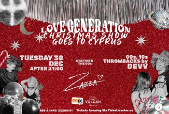 Christmas throwback party at ZAZZA Music Theatre — December 30, 2025. 2000s & 2010s hits, Love Generation vibes. Tickets available. Scroll down for English version 👇 Η Love Generation έρχεται για πρώτη φορά στην Κύπρο με ένα εκρηκτικό χριστουγεννιάτικο show γεμάτο νοσταλγία, χορό και θετική ενέργεια. Την Τρίτη 30 Δεκεμβρίου 2025, το ZAZZA Music Theatre φιλοξενεί μια βραδιά αφιερωμένη στις μεγαλύτερες επιτυχίες των 2000s, 2010s και αγαπημένα throwbacks. Η εμπειρία Love Generation υπόσχεται non-stop party διάθεση, δυνατά sing-along moments και ένα κοινό που μοιράζεται την ίδια αγάπη για τη μουσική μιας ολόκληρης εποχής. Οι πρώτοι που θα φτάσουν θα λάβουν Love Generation stickers, δίνοντας ακόμη πιο συλλεκτικό χαρακτήρα στη βραδιά. Η εκδήλωση ξεκινά μετά τις 21:00 και απευθύνεται σε όσους θέλουν να κλείσουν τη χρονιά με ένταση, χορό και αυθεντικά feel-good vibes. 🗓️ Πρόγραμμα Τρίτη, 30 Δεκεμβρίου 2025 | 21:00 (ZAZZA Music Theatre) Κρατήσεις & Πληροφορίες: 22255111 Εισιτήρια online: ticketmaster.cy EN The Love Generation Christmas Show arrives in Cyprus for the very first time, bringing an unforgettable throwback party to ZAZZA Music Theatre. On Tuesday, December 30, 2025, get ready for a night packed with 2000s, 2010s and classic throwback hits. Love Generation is all about shared memories, high energy and feel-good music that keeps the crowd dancing all night long. Early arrivals will receive Love Generation stickers, adding a fun collectible touch to the experience. Starting after 21:00, this festive event is the perfect way to celebrate the holiday season with friends, music and pure party vibes. 🗓️ Schedule Tuesday, December 30, 2025 | 21:00 (ZAZZA Music Theatre) RSV & Info: 22255111 Tickets online: ticketmaster.cy Explore more Nightlife & Parties → eventor.com.cy/events/category/nightlife---parties-128 ❓ FAQ Q: What music style can I expect? A: Hits from the 2000s, 2010s and popular throwbacks. Q: Where does the event take place? A: At ZAZZA Music Theatre. Q: What time does the event start? A: Doors open and the show starts after 21:00. Q: How can I get tickets or make a reservation? A: Tickets are available online via ticketmaster.cy, and for info call 22255111.