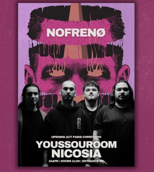 Οι Nofrenø κλείνουν τη χειμερινή τους σεζόν με live βραδιά στο Youssouroom στη Λευκωσία, Παρασκευή 24 Απριλίου 2026. Πόρτες 21:00. Είσοδος €5. --- Scroll down for English version 👇 --- Οι Nofrenø κλείνουν τη χειμερινή τους σεζόν με μια γιορτή στο αγαπημένο Youssouroom (Stou Teli) στη Λευκωσία, την Παρασκευή 24 Απριλίου 2026. Πόρτες ανοίγουν στις 21:00. Είσοδος: €5. 🎟️ Εισιτήρια από €5. Η βραδιά φέρνει καινούρια κομμάτια από το επερχόμενο EP της μπάντας, merch διαθέσιμο στον χώρο και arena για να χορέψετε. Το opening act αναλαμβάνει ο @paris_christophi, που θα ζεστάνει τη βραδιά. Για κρατήσεις στα πίσω τραπέζια και περισσότερες πληροφορίες: 99907501. 🗓️ Πρόγραμμα Παρασκευή, 24 Απριλίου 2026 | 21:00 (Youssouroom / Stou Teli, Λευκωσία) Τηλέφωνο: 99907501 ❓ Συχνές Ερωτήσεις Ε: Θα ακουστούν νέα κομμάτια ή μόνο παλιό υλικό; Α: Η μπάντα έχει ανακοινώσει ότι θα παρουσιαστούν καινούρια κομμάτια από το επερχόμενο EP τους. Ε: Υπάρχουν τραπέζια και πώς γίνεται κράτηση; Α: Ναι, υπάρχουν πίσω τραπέζια. Κρατήσεις στο 99907501. Ε: Υπάρχει ηλικιακό όριο εισόδου; Α: Δεν αναφέρεται στην πηγή. Επικοινωνήστε στο 99907501 για διευκρινίσεις. --- EN Nofrenø close out their winter season with a live celebration at Youssouroom (Stou Teli) in Nicosia, Cyprus, on Friday 24 April 2026. Doors open at 21:00. Entry is €5. 🎟️ Ticket prices start from €5. The night will feature new material from the band's upcoming EP, merch available on site, and a proper dancefloor arena. Opening the night is Paris Christophi (@paris_christophi). Back table reservations and further information available by phone. 🗓️ Schedule Friday, 24 April 2026 | 21:00 (Youssouroom / Stou Teli, Nicosia) Phone: 99907501 ❓ FAQ Q: Will the band play new material at this show? A: Yes — the band has announced that new tracks from their upcoming EP will be performed on the night. Q: Are tables available and how do I book one? A: Yes, back table reservations are available. Contact 99907501 to book. Q: Is there an age restriction for entry? A: Not stated in the source. Contact the venue on 99907501 for clarification. Explore more Concerts & Live Music → eventor.com.cy/events/category/concerts---live-music-114