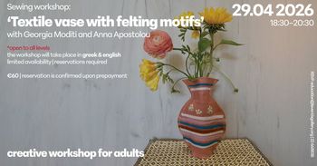 Δημιουργικό εργαστήρι ραπτικής «Υφασμάτινο βάζο με felting» στη Λεβεντείο Πινακοθήκη, Τετάρτη 29 Απριλίου 2026, 18:30–20:30. Κόστος €60 (με προπληρωμή). Περιορισμένες θέσεις. --- Scroll down for English version 👇 --- Την Τετάρτη 29 Απριλίου 2026, από τις 18:30 έως τις 20:30, η Λεβεντείος Πινακοθήκη Α.Γ. στη Λευκωσία φιλοξενεί δημιουργικό εργαστήρι ραπτικής σε συνεργασία με το Slow Sew: «Υφασμάτινο βάζο διακοσμημένο με την τεχνική του felting», με τις δασκάλες μόδας Γεωργία Μοδίτη και Άννα Αποστόλου. Κόστος: €60 (κράτηση ολοκληρώνεται με προπληρωμή). Περιορισμένος αριθμός θέσεων. Κατάλληλο για όλα τα επίπεδα. Οι συμμετέχοντες θα μάθουν βασικές τεχνικές ραπτικής και felting και θα δημιουργήσουν το δικό τους υφασμάτινο βάζο, εμπνευσμένο από το έργο του Pierre-Auguste Renoir «Λευκά Τριαντάφυλλα». Η τεχνική του felting (τεχνική διαμόρφωσης μαλλιού) θα αξιοποιηθεί για να διακοσμήσουν το βάζο τους με μοναδικά μοτίβα και υφές. Έμφαση στη δημιουργική έκφραση, στον πειραματισμό με υλικά και στην απόλαυση της διαδικασίας σε χαλαρό και υποστηρικτικό περιβάλλον. 🗓️ Πρόγραμμα Τετάρτη, 29 Απριλίου 2026 | 18:30–20:30 (Λεβεντείος Πινακοθήκη Α.Γ., Λευκωσία) Phone: +357 22 668838 (Δευτέρα–Παρασκευή, 09:00–13:00 & 14:00–16:30) Email: education@leventisfoundation.org --- EN This creative craft workshop for adults in Nicosia, Cyprus is presented by Slow Sew in collaboration with the A.G. Leventis Gallery on Wednesday, April 29, 2026 from 18:30 to 20:30. Titled «A Fabric Vase Decorated with the Felting Technique», the 2-hour session is led by fashion tutors Georgia Moditi and Anna Apostolou. Participation costs €60 (prepayment required to confirm reservation). Spaces are limited and the workshop is open to all levels. Inspired by Pierre-Auguste Renoir's painting «White Roses», participants will learn basic sewing and felting techniques and create their own fabric vase, decorating it with unique patterns and textures using the felting method (wool shaping technique). Throughout the workshop, emphasis is placed on creative expression, experimentation with materials, and enjoying the process in a relaxed and supportive environment. 🗓️ Schedule Wednesday, April 29, 2026 | 18:30–20:30 (A.G. Leventis Gallery, Nicosia) Phone: +357 22 668838 (Mon–Fri, 09:00–13:00 & 14:00–16:30) Email: education@leventisfoundation.org Explore more Art & Markets → eventor.com.cy/events/category/art---markets-118 --- ❓ FAQ Q: When and where does the workshop take place? A: The workshop takes place on Wednesday, April 29, 2026 from 18:30 to 20:30 at the A.G. Leventis Gallery in Nicosia. Q: What will participants create and what techniques will they learn? A: Participants will create a fabric vase decorated using the felting technique, inspired by Renoir's «White Roses». The session covers basic sewing and felting methods. Q: What is the cost and how do I reserve a spot? A: Participation costs €60. Reservation is confirmed with prepayment. Spaces are limited — contact the gallery to book. Q: Is prior experience required? A: No, the workshop is suitable for all levels.