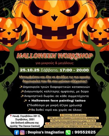 👉 Scroll down for English version Είσαι έτοιμος να ζήσεις τη μαγεία του Halloween; 🎃 Η Despina’s Imagination σε προσκαλεί σε ένα μοναδικό απογευματινό εργαστήριο, το Σάββατο, 25 Οκτωβρίου 2025, από τις 17:00 έως τις 20:00, στο Στρόβολο Λευκωσίας. 👻 Σε περιμένουν τρία διαφορετικά δημιουργικά εργαστήρια, διαγωνισμός καλύτερης στολής με δώρο, και αναμνηστικό δωράκι για κάθε συμμετέχοντα! Φόρεσε τη στολή σου, άφησε τη φαντασία σου ελεύθερη και έλα να περάσουμε ένα μαγικό φθινοπωρινό απόγευμα γεμάτο δημιουργία, μουσική και Halloween ατμόσφαιρα! 📍 Τοποθεσία: Strovolos, Λευκωσία 🗓️ Πρόγραμμα: Σάββατο, 25 Οκτωβρίου 2025 | 17:00 – 20:00 📞 Πληροφορίες & κρατήσεις: Μέσω μηνύματος στη σελίδα Despina’s Imagination https://tinyurl.com/y7erx4sw 🎨 Διοργάνωση: Despina’s Imagination by Despina Athanasiou 🎟️ Συμμετοχή κατόπιν κράτησης (περιορισμένες θέσεις) EN Get ready to experience the magic of Halloween in Nicosia! 🕸️ Join Despina’s Imagination for a creative and spooky Halloween Workshop on Saturday, October 25, 2025, from 5:00 PM to 8:00 PM, in Strovolos, Nicosia, Cyprus. 👻 Expect an afternoon full of creativity, fun, and Halloween spirit — with three themed art activities, a best costume contest, and special gifts for all participants! Put on your costume, unleash your imagination, and get ready for a magical, spooky celebration for all ages. 🗓️ Schedule: Saturday, October 25, 2025 | 17:00 – 20:00 📍 Location: Strovolos, Nicosia 🎨 Organized by: Despina’s Imagination (Despina Athanasiou) 📩 Info & bookings: Message Despina’s Imagination page on Facebook https://tinyurl.com/y7erx4sw 🎟️ Participation by pre-registration (limited spots available) Explore more Art & Crafts → https://eventor.com.cy/events/category/art---craft-118 ❓ Micro-FAQ Q: What time does it start? A: From 17:00 to 20:00 on Saturday, October 25, 2025. Q: Is it suitable for kids? A: Yes! It’s a family-friendly creative event for all ages. Q: How can I register? A: Send a direct message to Despina’s Imagination on Facebook. Q: Do I need to wear a costume? A: Costumes are encouraged — there’s a best costume contest!