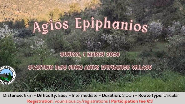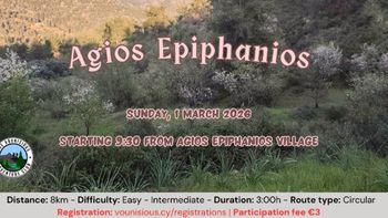Welcome spring with a guided hike on Sunday, March 1, 2026, featuring blossomed almond trees, Chalazis hill and scenic viewpoints. Tickets available. Scroll down for English version 👇 Η πεζοπορία «Welcome Spring» είναι μια ανοιξιάτικη εξόρμηση με διαδρομή ειδικά σχεδιασμένη από τη Vounisious, ιδανική για να σηματοδοτήσει την αλλαγή της εποχής. Η πορεία κινείται μέσα από αγροτικούς δρόμους και φυσικά τοπία, με ανθισμένες αμυγδαλιές, τον λόφο Χαλάζης και όμορφα σημεία θέας που προσφέρουν χαλαρή αλλά ουσιαστική εμπειρία στη φύση. Η διαδρομή είναι κυκλική, εύκολη έως μέτριας δυσκολίας, κατάλληλη για πεζοπόρους με βασική εμπειρία. Η συμμετοχή γίνεται μόνο με προεγγραφή και προπληρωμή, ενώ η ομάδα συνοδεύεται από πιστοποιημένο αρχηγό πεζοπορίας. 🎟️ Εισιτήρια από €3. 🗓️ Πρόγραμμα Κυριακή, 1 Μαρτίου 2026 | 09:30 Σημείο συνάντησης: 09:15 (Εκκλησία Αγίου Επιφανίου) Χάρτης σημείου συνάντησης: bit.ly/AgiosEpiphaniosChurch EN This outdoor activity in Cyprus is a guided spring hike taking place on Sunday, March 1, 2026. Designed by Vounisious, the route highlights blossomed almond trees, Chalazis hill, and scenic viewpoints, offering a relaxed yet engaging outdoor experience. The circular route is rated Easy–Intermediate, covering approximately 8 km with an estimated duration of around 3 hours. The hike consists mainly of country road with a short asphalt section. Participation is pre-paid, registration is mandatory, and the group is led by a certified hiking leader. 🎟️ Ticket prices start from €3. 🗓️ Schedule Sunday, March 1, 2026 | 09:30 Meeting time: 09:15 (Agios Epiphanios Church) Meeting point map: bit.ly/AgiosEpiphaniosChurch Explore more Outdoor & Adventure → eventor.com.cy/events/category/outdoor---adventure-125 ❓ FAQ Q: What is the difficulty level of the hike? A: Easy–Intermediate. Q: How long is the route? A: Approximately 8 km, about 3 hours. Q: Is registration required? A: Yes, registration and pre-payment are mandatory. Q: What time should participants arrive? A: Arrival is requested at 09:15, with a 09:30 start.