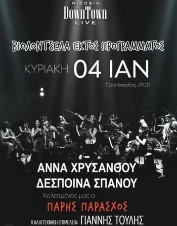 Explosive cello live show in Nicosia — January 4, 2026. Violonchela Ekτός Programmatos return to Downtown Live for one night only. Scroll down for English version ⯆ Επιστρέφουμε εκεί που ξεκίνησαν όλα, για μια μοναδική και ανεπανάληπτη εμφάνιση στη σκηνή του Downtown Live. Τα «Βιολοντσέλα Εκτός Προγράμματος», μετά από μια χρονιά γεμάτη sold-out παραστάσεις σε Ελλάδα και Κύπρο, επιστρέφουν με μια εκρηκτική μουσική εμπειρία που ξεφεύγει από κάθε συμβατικό πλαίσιο. Πέντε βιολοντσέλα, ένα κοντραμπάσο και κρουστά ενώνονται σε ένα ζωντανό, ανατρεπτικό σχήμα που αφήνει πίσω του το «επίσημο» ρεπερτόριο και ταξιδεύει στους πιο απρόβλεπτους διαδρόμους του ελληνικού τραγουδιού. Μαζί τους επί σκηνής, η Άννα Χρυσάνθου και η Δέσποινα Σπανού, με εκφραστικές ερμηνείες και σύγχρονη αισθητική. Ξεχωριστή παρουσία της βραδιάς ο ανερχόμενος Πάρης Παράσχος, που προσθέτει τη δική του φρέσκια καλλιτεχνική σφραγίδα. Την καλλιτεχνική επιμέλεια και ενορχήστρωση υπογράφει ο πολυβραβευμένος βιολοντσελίστας Γιάννης Τουλής, δημιουργώντας πρωτότυπες μουσικές «εκτροπές» που καθηλώνουν. 🎟️ Εισιτήρια κατόπιν κράτησης. 🗓️ Πρόγραμμα Κυριακή, 4 Ιανουαρίου 2026 | 21:00 (Doors open 20:00 – Downtown Live) Πληροφορίες & Κρατήσεις: Τηλέφωνο: +357 99 810011 EN A powerful return to where it all began. Violonchela Ekτός Programmatos come back to the Downtown Live stage for a one-night-only explosive performance after a year of sold-out shows across Greece and Cyprus. Five cellos, double bass and percussion form a bold, genre-defying ensemble that abandons conventional repertoire and dives into the most unexpected paths of Greek music. Joining them on stage are Anna Chrysanthou and Despina Spanou, delivering expressive performances with a fresh contemporary edge. Rising artist Paris Paraschos brings his unique sound and energy to the night, while artistic direction and orchestration are led by award-winning cellist Giannis Toulis, shaping the evening’s original musical twists. 🎟️ Tickets available via reservation. 🗓️ Schedule Sunday, January 4, 2026 | 21:00 (Doors open 20:00 – Downtown Live) Info & Reservations: Phone: +357 99 810011 Explore more Concerts & Live Music → eventor.com.cy/events/category/concerts---live-music-114 ❓ FAQ Q: What type of event is this? A: A live music performance blending cello, percussion and Greek repertoire in a modern, experimental format. Q: Where does the event take place? A: At Downtown Live in Nicosia. Q: What time do doors open? A: Doors open at 20:00, with the show starting at 21:00. Q: How can I reserve tickets? A: By calling +357 99 810011.