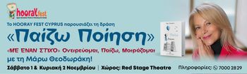👉 Scroll down for English version Η Μάρω Θεοδωράκη, μουσικός και συγγραφέας με πάνω από 60 παιδικές και εφηβικές εκδόσεις, παρουσιάζει για πρώτη φορά στην Κύπρο τη Βιωματική Δράση για Γονείς και Παιδιά (6+) με τίτλο «ΜΕ ΕΝΑΝ ΣΤΙΧΟ» Ονειρεύομαι, Παίζω, Μοιράζομαι, στο Red Stage Theatre στη Λευκωσία, το Σάββατο 1 και την Κυριακή 2 Νοεμβρίου 2025. 🎟️ Εισιτήρια από €20. ☎️ Πληροφορίες: 7000 28 29 Η δράση βασίζεται στο νέο της βιβλίο “Παίζω Ποίηση” (εκδόσεις Μικρός Μετρονόμος, 2024) και εστιάζει στις αξίες, τις εμπειρίες και τα συναισθήματα. Μέσα από διαδραστικό παιχνίδι, ποίηση, πιάνο, τραγούδι και δραματοποίηση στίχων, τα παιδιά και οι γονείς καλούνται να ονειρευτούν, να εκφραστούν και να μοιραστούν τη χαρά της δημιουργίας. 🗓️ Πρόγραμμα: Σάββατο 1 Νοεμβρίου 2025 | 10:30 – 12:30 & 15:30 – 18:00 Κυριακή 2 Νοεμβρίου 2025 | 10:30 – 12:30 📍 Red Stage Theatre, Λευκωσία 👨👩👧 Για γονείς & παιδιά ηλικίας 6+ EN Maro Theodoraki, musician and author of over 60 children’s and teen books, presents for the first time in Cyprus her experiential family workshop “ME ENAN STICHO: Dream, Play, Share”, at Red Stage Theatre, Nicosia, on Saturday 1 and Sunday 2 November 2025. 🎟️ Ticket prices start from €20. ☎️ Info: 7000 28 29 Based on her latest book “Paizo Poiisi” (Playing Poetry), published by Mikros Metronomos (2024), this creative action combines poetry, music, storytelling, and play to awaken children’s imagination and emotional intelligence. Parents and kids (6+) will explore values, experiences, and emotions through song, rhythm, and interactive expression, joined by a guest actor. 🗓️ Schedule: Saturday, November 1, 2025 | 10:30 – 12:30 & 15:30 – 18:00 Sunday, November 2, 2025 | 10:30 – 12:30 📍 Red Stage Theatre, Nicosia, Cyprus 👨👩👧 For parents & children aged 6+ Explore more Family & Kids → https://eventor.com.cy/events/category/family---kids-112 ❓ Micro-FAQ Q: What time does it run? A: Morning sessions at 10:30–12:30 and afternoon at 15:30–18:00 on November 1–2, 2025. Q: Is it family-friendly? A: Yes, it’s designed for parents and children aged 6 and above. Q: How can I get more information or register? A: Call ☎️ 7000 28 29 for details and reservations.