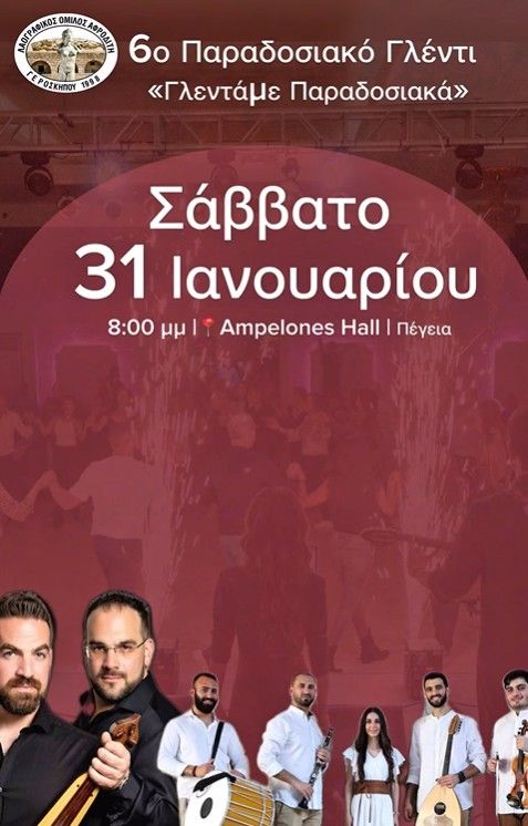 Ζήστε ένα αυθεντικό παραδοσιακό γλέντι στην Πέγεια τον Ιανουάριο 2026 με ζωντανή μουσική, κυπριακό φαγητό, ποτό και χορούς από όλο τον ελληνισμό. Scroll down for English version 👇 Το ετήσιο παραδοσιακό γλέντι του Λαογραφικού Ομίλου “Αφροδίτη” Γεροσκήπου επιστρέφει για 6η χρονιά, επιβεβαιώνοντας τον χαρακτήρα του ως μια ζεστή συνάντηση παρέας και παράδοσης. Η βραδιά συνδυάζει ζωντανή μουσική, αυθεντικό φαγητό, κυπριακό ποτό και ασταμάτητο χορό, σε έναν χώρο ιδανικό για γλέντι. Δύο ορχήστρες και οκτώ μουσικοί ταξιδεύουν το κοινό από την Κύπρο μέχρι τη Θράκη, τη Μικρά Ασία, τη Μακεδονία, την Ήπειρο, τα Νησιά και τον Πόντο. Το πρόγραμμα περιλαμβάνει ποντιακή λύρα, νταούλι, λαούτο, κλαρίνο, γκάιντα, τσαμπούνα, βιολί και φωνές, δημιουργώντας μια ολοκληρωμένη παραδοσιακή εμπειρία. 🎶 🎟️ Εισιτήρια από €30. 🗓️ Πρόγραμμα Σάββατο, 31 Ιανουαρίου 2026 | 20:00 (Ampelones Hall, Pegia) Phone: 96 550082 EN This annual traditional glenti in Pegia, Cyprus brings together live folk music, food, and dance for an authentic winter celebration. Organised by the Aphrodite Folklore Group of Geroskipou, the event has become a local tradition focused on togetherness, culture, and shared enjoyment. Two live ensembles with eight musicians guide the audience through musical traditions from Cyprus, Thrace, Asia Minor, Macedonia, Epirus, the Greek islands, and Pontus. With instruments such as Pontic lyra, clarinet, bagpipes, violin, and percussion, the evening is designed for continuous dancing, communal dining, and a relaxed festive atmosphere. 🥁 🎟️ Ticket prices start from €30. 🗓️ Schedule Saturday, January 31, 2026 | 20:00 (Ampelones Hall, Pegia) Phone: 96 550082 Explore more Food & Drinks → eventor.com.cy/events/category/food---drink-events-165 ❓ FAQ Q: What is included in the ticket price? A: The ticket includes food and unlimited Cypriot drinks such as beer, wine, and soft drinks. Q: Are tickets available at the door? A: No. Tickets are available by pre-sale only, up to January 25, subject to limited availability. Q: Will there be alcoholic drinks besides those included? A: Yes. Zivania will be available for purchase separately. Q: Is this event suitable for dancing? A: Yes. The programme is designed for continuous traditional dancing throughout the evening.