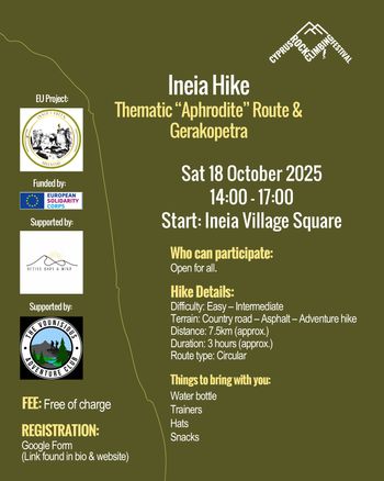 👉 Scroll down for English version Η ομάδα Active Body and Mind σε συνεργασία με την ομάδα Vounisious – Adventure Club, στο πλαίσιο του έργου αλληλεγγύης “The Innia Green Adventure project”, προσκαλεί νέους 18–35 ετών σε μια μοναδική πεζοπορία στην περιοχή της Ίνειας το Σάββατο, 18 Οκτωβρίου 2025, από τις 14:00 έως τις 17:00. Η δραστηριότητα προσφέρει την ευκαιρία να γνωρίσετε το μαγευτικό φυσικό τοπίο με τα βραχώδη συγκροτήματα Κοράτζι, Αλυκού και Γερακόπετρα. 🎟️ Είσοδος ελεύθερη. 📞 97635417 | 99541017 | 99112960 🌐 Δήλωση συμμετοχής: https://forms.gle/vUBYuiGZGYYCqwYs8 Η πεζοπορία πραγματοποιείται στο πλαίσιο του Cyprus Rock Climbing Festival 2025, το οποίο διεξάγεται στις 17–19 Οκτωβρίου στην Ίνεια, με διοργανωτή φορέα τον Active Zone Outdoor και την υποστήριξη του Υπουργείου Γεωργίας, Αγροτικής Ανάπτυξης και Περιβάλλοντος. Τον συντονισμό αναλαμβάνει ο Σταύρος από την ομάδα Vounisious – Adventure Club. ⛰️ 🗓️ Πρόγραμμα: Σάββατο, 18 Οκτωβρίου 2025 | 14:00 – 17:00 📍 Σημείο συνάντησης: Πλατεία Ίνειας ➡️ Παρακαλούμε φτάστε στις 13:45 στην πλατεία του χωριού. Πληροφορίες διαδρομής: • Τύπος: Κυκλική πεζοπορία • Έδαφος: Επαρχιακός δρόμος – Άσφαλτος – Μονοπάτι περιπέτειας • Απόσταση: 7,5 χλμ. • Δυσκολία: Εύκολη έως μέτρια • Διάρκεια: 3 ώρες περίπου Προτεινόμενος εξοπλισμός: Καπέλο, μακρύ παντελόνι, παπούτσια πεζοπορίας, ρούχα ανάλογα με τον καιρό, μπαστούνια, σνακ, ηλεκτρολύτες και τουλάχιστον 1,5 λίτρο νερό. 💧 EN The Active Body and Mind team, in collaboration with Vounisious – Adventure Club, invites young people aged 18–35 to join the Innia Green Adventure Project — a scenic hike through the Ineia region of Paphos on Saturday, October 18, 2025, from 14:00 to 17:00. Participants will explore the breathtaking rock formations of Koratzi, Alykou, and Gerakopetra. 🎟️ Free entry. 📞 +357 97635417 | +357 99541017 | +357 99112960 🌐 Registration: https://forms.gle/vUBYuiGZGYYCqwYs8 This activity is part of the Cyprus Rock Climbing Festival 2025, taking place from October 17–19 in Ineia, organized by Active Zone Outdoor under the Ministry of Agriculture, Rural Development, and Environment. The hike will be coordinated by Stavros, a certified hiking guide from Vounisious – Adventure Club. ⛰️ 🗓️ Schedule: Saturday, October 18, 2025 | 14:00 – 17:00 📍 Meeting point: Ineia Village Square Please arrive by 13:45 to ensure a timely start. Trail information: • Route type: Circular trail • Terrain: Road – Asphalt – Adventure path • Distance: 7.5 km • Difficulty: Easy to moderate • Duration: Approximately 3 hours Recommended gear: Hat, long pants, hiking shoes, weather-appropriate clothing, trekking poles, snacks, electrolytes, and at least 1.5L of water. 💧 Explore more Outdoor → https://eventor.com.cy/events/category/outdoor-125 ❓ Micro-FAQ Q: What time does it run? A: From 14:00 to 17:00 on Saturday, October 18, 2025. Q: Is it free to join? A: Yes, participation is completely free — just register via the provided form. Q: What should I bring? A: Bring hiking shoes, hat, water (at least 1.5L), and weather-appropriate clothes.