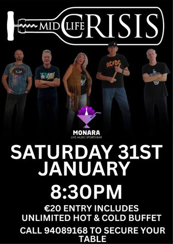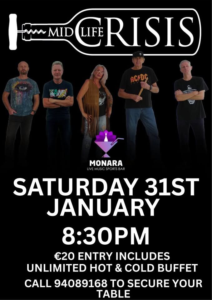 Live rock concert in Paphos, Cyprus — January 31, 2026. Mid Life Crisis perform classic hits at Monara Live Music & Sports Bar. Tickets available. Scroll down for English version 👇 Ένα δυνατό Σάββατο βράδυ γεμάτο ροκ ενέργεια έρχεται στην Πάφο, με τους Mid Life Crisis να ανεβαίνουν στη σκηνή του Monara Live Music & Sports Bar. Το Σάββατο 31 Ιανουαρίου 2026, το κοινό ετοιμάζεται για μια ζωντανή εμφάνιση με κλασικά rock τραγούδια, έντονα φωνητικά και ασταμάτητο ρυθμό. Η μπάντα υπόσχεται μια βραδιά γεμάτη αυθεντικό rock vibe, ιδανική για όσους αγαπούν τις μεγάλες επιτυχίες, την άμεση επαφή με το κοινό και την ηλεκτρισμένη ατμόσφαιρα ενός live bar show. Η εμπειρία συμπληρώνεται με φαγητό, μουσική και δυνατή διάθεση μέχρι αργά. 🎸🔥 Το Monara, στον Τάφο των Βασιλέων, αποτελεί σημείο αναφοράς για τις live μουσικές βραδιές στην Πάφο, προσφέροντας άνετο χώρο, εξαιρετικό ήχο και παρεΐστικο περιβάλλον για μια αξέχαστη έξοδο. 🍻 🎟️ Εισιτήρια από €20 (περιλαμβάνει απεριόριστο ζεστό & κρύο μπουφέ). 🗓️ Πρόγραμμα Σάββατο, 31 Ιανουαρίου 2026 | 20:30 (Monara Live Music & Sports Bar, Πάφος) Τηλέφωνο κρατήσεων: 94089168 EN This live rock event in Paphos, Cyprus, takes place on Saturday, January 31, 2026, at Monara Live Music & Sports Bar. Mid Life Crisis hit the stage with a high-energy set packed with rock classics, powerful vocals, and an electrifying Saturday night atmosphere. Expect an unforgettable evening filled with timeless rock hits, great sound, and a crowd-ready vibe that keeps the energy high from start to finish. The night combines live music with good food and unbeatable bar ambience, making it a perfect weekend plan for rock fans. 🎸🔥 Located in the Tomb of the Kings area, Monara is a popular live music venue in Paphos, known for its welcoming setting and lively performances. 🍻 🎟️ Ticket prices start from €20 (includes unlimited hot & cold buffet). 🗓️ Schedule Saturday, January 31, 2026 | 20:30 (Monara Live Music & Sports Bar, Paphos) Reservations: 94089168 Explore more Concerts & Live Music → eventor.com.cy/events/category/concerts---live-music-114 ❓ FAQ Q: What kind of music will be played? A: Rock classics with high-energy live performance. Q: Where is the venue located? A: At Monara Live Music & Sports Bar in the Tomb of the Kings area, Paphos. Q: Does the ticket include food? A: Yes, the €20 ticket includes an unlimited hot and cold buffet. Q: What time does the concert start? A: The live performance starts at 20:30.