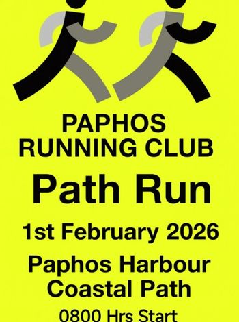Join the Paphos Running Club Path Run on February 1, a free 5km coastal run starting from Paphos Harbour with volunteers, pacers, and great views. Scroll down for English version 👇 Το Paphos Running Club Path Run είναι η μηνιαία δωρεάν διαδρομή 5 χιλιομέτρων του συλλόγου, που πραγματοποιείται κατά μήκος του παραλιακού μονοπατιού της Πάφου. Την Κυριακή 1 Φεβρουαρίου, οι δρομείς ξεκινούν από το Κάστρο της Πάφου στο Λιμάνι, απολαμβάνοντας μια επίπεδη και όμορφη διαδρομή δίπλα στη θάλασσα. Η εκκίνηση δίνεται στις 08:00 και στη διαδρομή θα υπάρχουν εθελοντές για υποστήριξη και εμψύχωση. Διατίθενται pacers για χρόνους 20, 22, 25, 28, 30 και 35 λεπτών για όσους επιθυμούν να τρέξουν με συγκεκριμένο ρυθμό. Απαραίτητη είναι η προεγγραφή μέσω του Paphos Running Club, εκτός αν είστε ήδη εγγεγραμμένοι. 🎟️ Δωρεάν είσοδος. 🗓️ Πρόγραμμα Κυριακή, 1 Φεβρουαρίου 2026 | 08:00 (Paphos Harbour Coastal Path, Πάφος) Για περισσότερες πληροφορίες και εγγραφές, επικοινωνήστε απευθείας με τους διοργανωτές. EN This outdoor sports event in Paphos, Cyprus is the monthly Paphos Running Club Path Run, a free 5km run along the Paphos Harbour coastal path. Taking place on Sunday, February 1, runners start from the Castle at the Harbour and follow a flat, scenic seaside route. The run begins at 08:00, with volunteers cheering participants along the way. Pacers are available for 20, 22, 25, 28, 30, and 35-minute finish times. Registration is required unless you are already registered with the Paphos Running Club. 🎟️ Free entry. 🗓️ Schedule Sunday, February 1, 2026 | 08:00 (Paphos Harbour Coastal Path, Paphos) For more information and registration details, please contact the organiser directly. Explore more Sports & Fitness → eventor.com.cy/events/category/sports---fitness-111 ❓ FAQ Q: How long is the run? A: The route is 5 kilometres. Q: Is there a participation fee? A: No, the run is free to join. Q: Where does the run start? A: From the Castle at Paphos Harbour. Q: Are pacers available? A: Yes, pacers are available for multiple finish times.