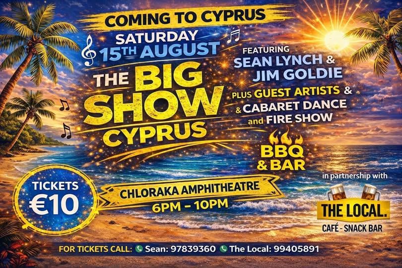 The Big Show Cyprus lands at Chloraka Amphitheatre in Paphos on Saturday 15 August 2026, 18:00–22:00 — Sean Lynch, Jim Goldie, cabaret dance, fire show and BBQ. Tickets €10. --- Scroll down for English version 👇 --- Το The Big Show Cyprus έρχεται στο Αμφιθέατρο της Χλώρακας στην Πάφο, το Σάββατο 15 Αυγούστου 2026, από τις 18:00 έως τις 22:00. Διοργάνωση: Sean Lynch σε συνεργασία με The Local Pub. 🎟️ Εισιτήρια από €10. Η βραδιά φέρνει live εμφανίσεις των Sean Lynch και Jim Goldie, special guest artists, high-energy cabaret dance show, fire show, BBQ και bar για όλη τη νύχτα. Μια βραδιά που συνδυάζει ζωντανή μουσική, θέαμα και καλοκαιρινή ατμόσφαιρα για όλη την οικογένεια και τους φίλους. 🗓️ Πρόγραμμα Σάββατο, 15 Αυγούστου 2026 | 18:00–22:00 (Αμφιθέατρο Χλώρακας, Πάφος) Τηλέφωνο (πληροφορίες & εισιτήρια): 97839360 (Sean) / 99405891 (The Local) ❓ Συχνές Ερωτήσεις Ε: Είναι η εκδήλωση κατάλληλη για οικογένειες με παιδιά; Α: Δεν αναφέρεται ηλικιακό όριο στην πηγή. Ο χαρακτήρας της εκδήλωσης ως family-friendly υποδηλώνεται από την πρόσκληση. Επικοινωνήστε με τους διοργανωτές για διευκρινίσεις. Ε: Χρειάζεται κράτηση ή μπορώ να αγοράσω εισιτήριο στην πόρτα; Α: Τα εισιτήρια διατίθενται τηλεφωνικώς στα 97839360 και 99405891. Συνιστάται έγκαιρη αγορά καθώς τα εισιτήρια πωλούνται γρήγορα. Ε: Περιλαμβάνεται το φαγητό στην τιμή του εισιτηρίου; Α: Όχι. BBQ και bar είναι διαθέσιμα καθ' όλη τη διάρκεια της βραδιάς αλλά δεν διευκρινίζεται αν περιλαμβάνονται στην τιμή του εισιτηρίου. Επικοινωνήστε με τους διοργανωτές για λεπτομέρειες. --- EN The Big Show Cyprus comes to Chloraka Amphitheatre in Paphos, Cyprus, on Saturday 15 August 2026 from 18:00 to 22:00, organised by Sean Lynch in partnership with The Local Pub. 🎟️ Ticket prices start from €10. The night features live performances by Sean Lynch and Jim Goldie, special guest artists, a high-energy cabaret dance show, a jaw-dropping fire show, and BBQ and bar available all night. A summer night of live music, spectacle, and great company — bring your friends and family. 🗓️ Schedule Saturday, 15 August 2026 | 18:00–22:00 (Chloraka Amphitheatre, Paphos) Phone (info & tickets): 97839360 (Sean) / 99405891 (The Local) ❓ FAQ Q: Is this event suitable for families with children? A: No age restriction is stated in the source. The event is described as a night for friends and family. Contact the organiser for clarification. Q: Do I need to book in advance? A: Tickets are available by calling 97839360 or 99405891. Early purchase is recommended as tickets are selling fast. Q: Is food included in the ticket price? A: BBQ and bar are available all night but it is not specified whether these are included in the ticket price. Contact the organiser for details. Explore more Live Shows & Comedy → eventor.com.cy/events/category/live-shows---comedy-148
