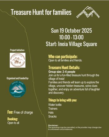 👉 Scroll down for English version Ο οργανισμός Active Zone Outdoor προσκαλεί οικογένειες να φτιάξουν τις ομάδες τους και να συμμετάσχουν στο Κυνήγι Θησαυρού στην Ίννεια, την Κυριακή, 19 Οκτωβρίου 2025, μεταξύ 10:00 – 13:00. Οι ομάδες μπορούν να ξεκινήσουν οποιαδήποτε ώρα μεταξύ 10:00 και 12:00. 🎟️ Είσοδος ελεύθερη. 📞 Επικοινωνία: 97635417 📍 Σημείο συνάντησης: Κεντρική Πλατεία Ίνειας Γονείς και παιδιά θα έχουν την ευκαιρία να εξερευνήσουν την Ίννεια μέσα από ένα συναρπαστικό οικογενειακό παιχνίδι θησαυρού! Θα συνεργαστούν για να λύσουν γρίφους, να ανακαλύψουν κρυμμένους θησαυρούς και να απολαύσουν μια εμπειρία γεμάτη διασκέδαση, δράση και έκπληξη. 🗝️ ❗ Το παιχνίδι θησαυρού πραγματοποιείται με την υποστήριξη της εφαρμογής Action Bound. ⛰ Η δραστηριότητα αποτελεί μέρος του Cyprus Rock Climbing Festival 2025 (17–19 Οκτωβρίου), που διεξάγεται στην περιοχή της Ίνειας με διοργανωτή τον Active Zone Outdoor. 🗓️ Πρόγραμμα: Κυριακή, 19 Οκτωβρίου 2025 | 10:00 – 13:00 📍 Τοποθεσία: Κεντρική Πλατεία Ίνειας EN Active Zone Outdoor invites families to create their teams and join the Family Treasure Hunt in Ineia, on Sunday, October 19, 2025, between 10:00 and 13:00. Teams can start their adventure any time between 10:00 and 12:00. 🎟️ Free entry. 📞 Contact: +357 97635417 📍 Meeting place: Ineia Village Main Square Parents and kids will enjoy a thrilling family treasure hunt through the picturesque village of Ineia — solving riddles, finding clues, and uncovering hidden treasures in a fun, interactive experience. 🗝️ ❗ The treasure hunt is supported by the Action Bound app. ⛰ This activity is part of the Cyprus Rock Climbing Festival 2025 (October 17–19), held in the Ineia rock area and organized by Active Zone Outdoor. 🗓️ Schedule: Sunday, October 19, 2025 | 10:00 – 13:00 📍 Location: Ineia Village Main Square Explore more Family & Kids → https://eventor.com.cy/events/category/family---kids-112 ❓ Micro-FAQ Q: What time does it run? A: From 10:00 to 13:00 on Sunday, October 19, 2025. Teams can start between 10:00 and 12:00. Q: Is it suitable for children? A: Yes — the treasure hunt is designed for families with kids of all ages. Q: What should we bring? A: Comfortable clothes, water, and a good spirit of adventure!